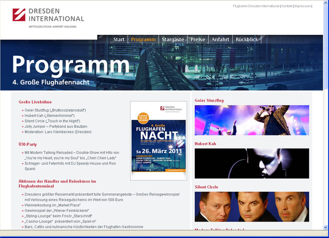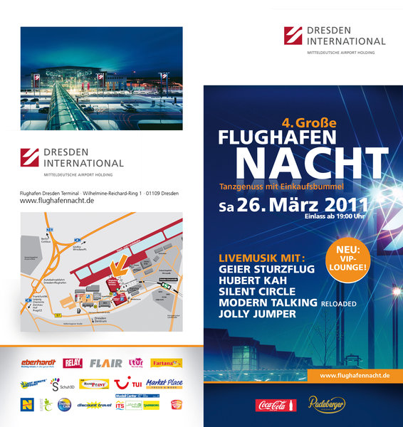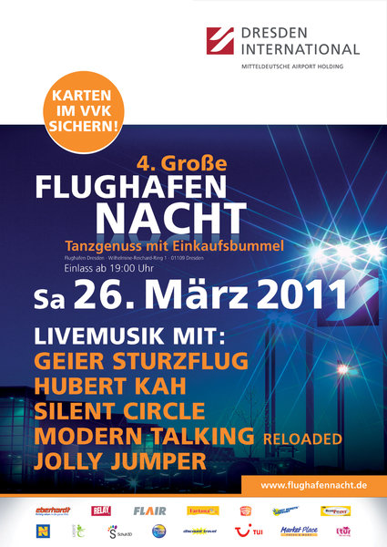 Im Rahmen der Vermarktung des Flughafen Dresdens und anlässlich des 10. Geburtstag des Terminals verwandelte sich das gesamte Flughafengebäude im März 2011 in einen Party- und Shopping-Tempel. Unter dem Motto "Tanzgenuss mit Einkaufsbummel" bot die 4. Große Flughafennacht ein großes Künstleraufgebot, kulinarische Köstlichkeiten, Aktionsangebote von Händlern und Reisebüros sowie ein beeindruckendes Rahmenprogramm. Auf einer großen Live-Bühne sorgten u.a. Geier Sturzflug, Jolly Jumper und eine Modern Talking Reloaded-Double Show für ausgelassene Stimmung unter den über 2.500 Gästen. Neben Gewinnspielen und Autogrammstunden konnte man sich in der Styling-Lounge den passenden Starschnitt verpassen lassen oder in der Casino-Lounge sein Glück versuchen.