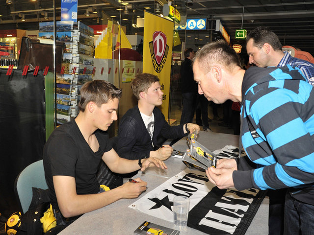 Die auftretenden Künstler, einige Schmetterlinge des Dresdner SC und Kicker der SG Dynamo Dresden schrieben fleißig Autogramme.