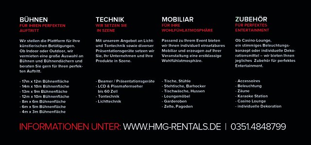 Mit unserem hauseigenen Eventverleih HMG RENTAL SERVICES verfügen wir über einen umfangreichen Equipmentbestand